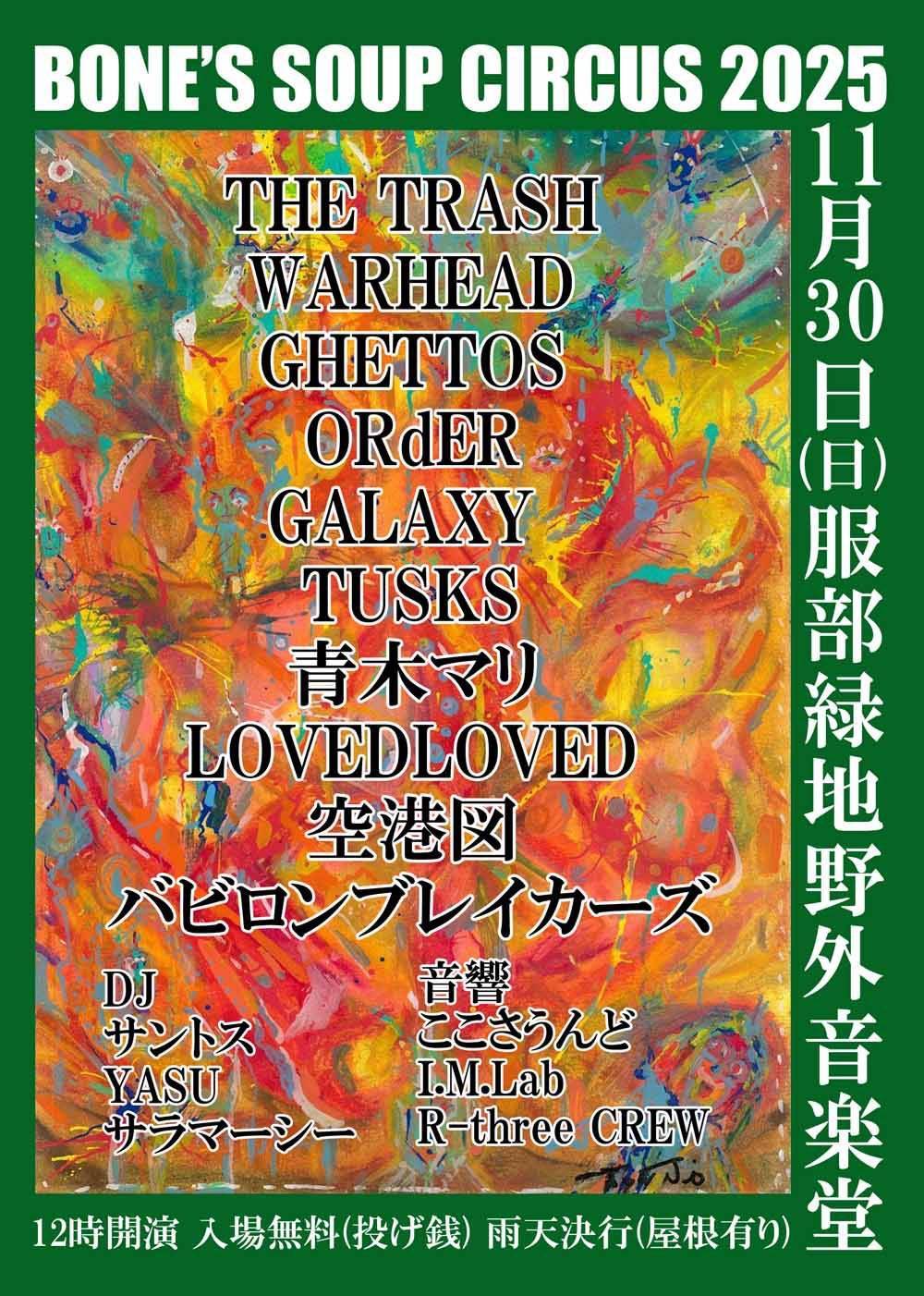 BONE’S SOUP CIRCUS 2025 服部緑地野外音楽堂 2025/11/30(日) DATE 2025/11/30(日) AREA 大阪 VENUE 服部緑地野外音楽堂 ADV/DOOR 無料(投げ銭) OP/ST 12時開演 TICKET