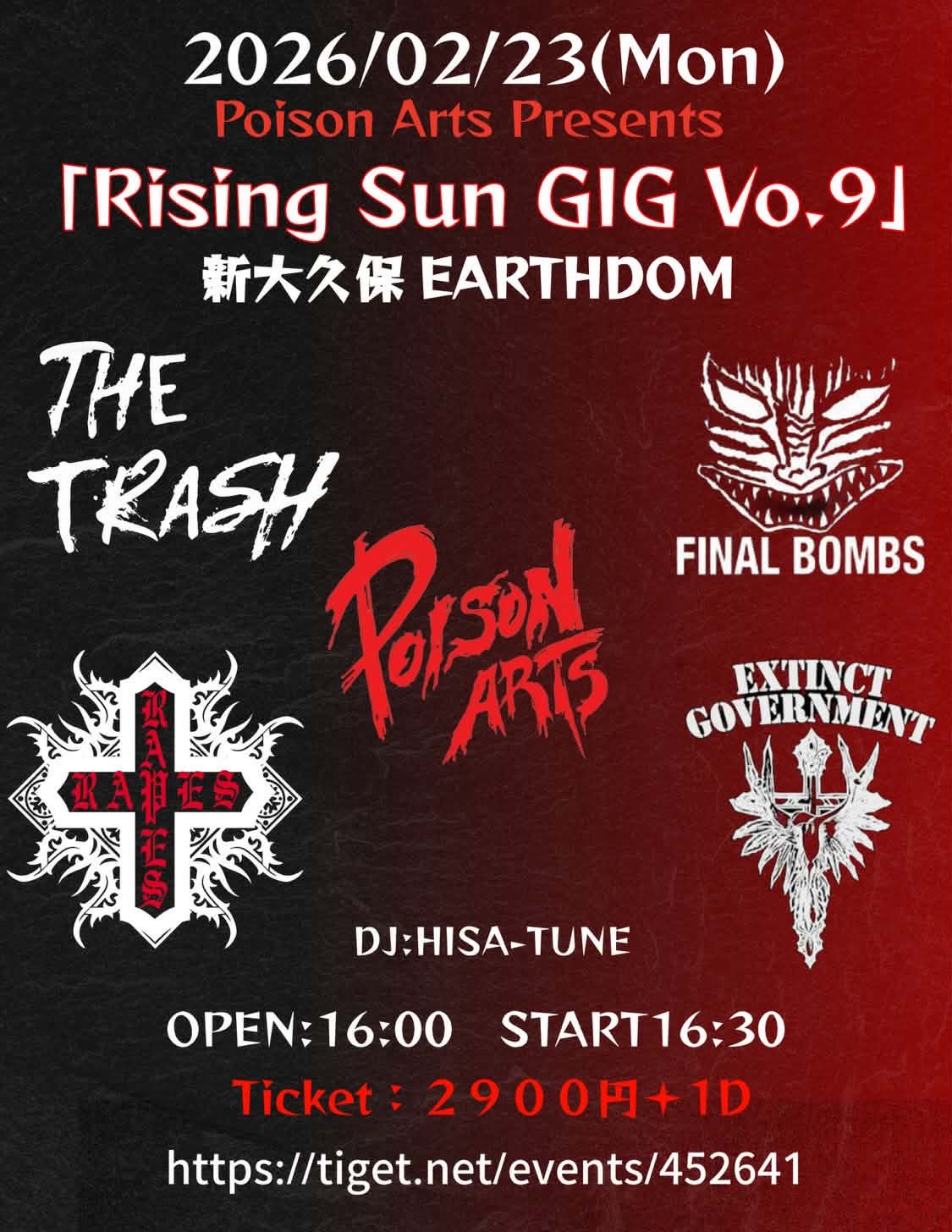 POISON ARTS Presents RISING SUN GIG Vol9 新大久保アースダム 2026/02/23(月祝) DATE 2026/02/23(月祝) AREA 東京 VENUE 新大久保アースダム ADV/DOOR 前売り当日共に2900円+1D OP/ST OPEN16:00 START16:30 TICKET TIGET